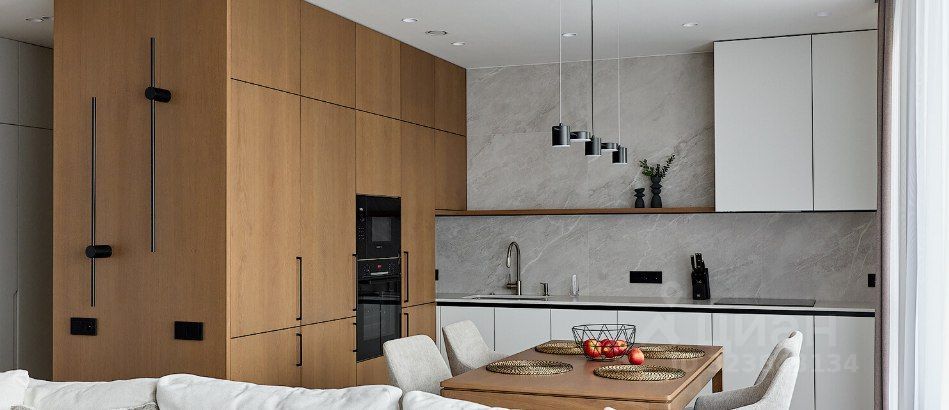 Встроенная кухня оборудована всем необходимым - бытовая техника Bosch: варочная панель, духовая печь, микроволновка, посудомоечная машина, холодильник Liebherr, вытяжка Elica, мойка из нержавеющей стали Franke, измельчитель бытовых отходов, установлена фильтрация воды; столовая группы выполнена из натуральных пород дерева.