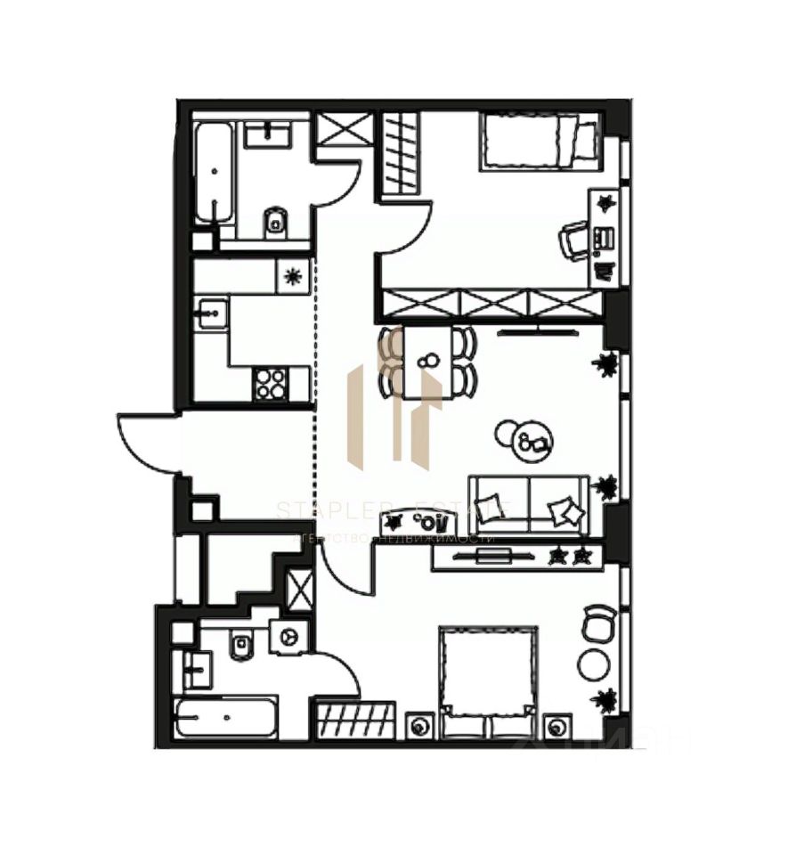 - Планировка предполагает: просторную кухню-гостиную, две спальни, два санузла