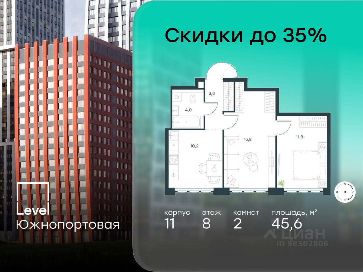 В северной части района Печатники продается 2-комнатная квартира площадью 45.60 кв.м без отделки. Квартира расположена на 8 этаже 16-этажного корпуса 11 в жилом комплексе комфорт-класса Level Южнопортовая (компания Level Group/Левел групп).