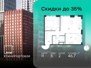 В северной части района Печатники продается 2-комнатная квартира площадью 46.70 кв.м без отделки. Квартира расположена на 5 этаже 16-этажного корпуса 11 в жилом комплексе комфорт-класса Level Южнопортовая (компания Level Group/Левел групп).