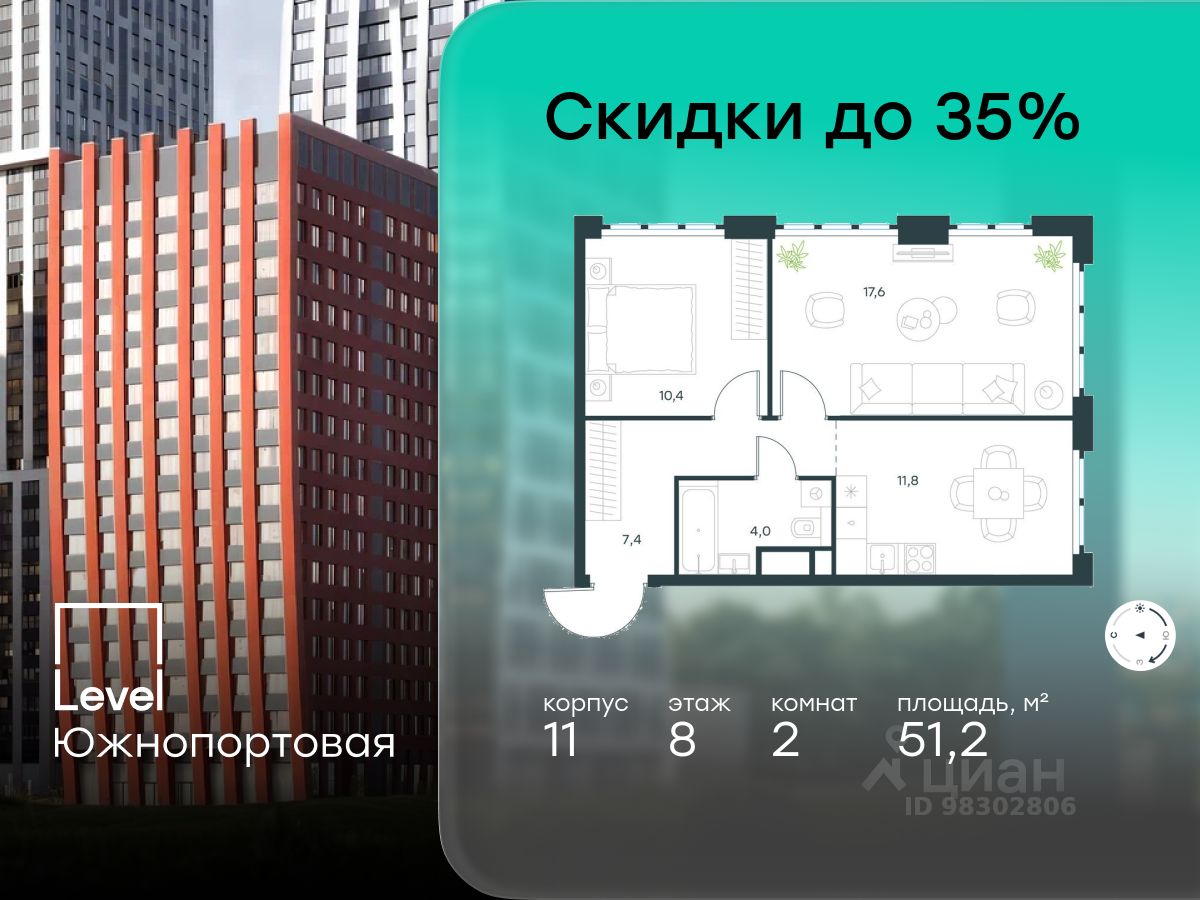 В северной части района Печатники продается 2-комнатная квартира площадью 51.20 кв.м без отделки. Квартира расположена на 8 этаже 16-этажного корпуса 11 в жилом комплексе комфорт-класса Level Южнопортовая (компания Level Group/Левел групп).