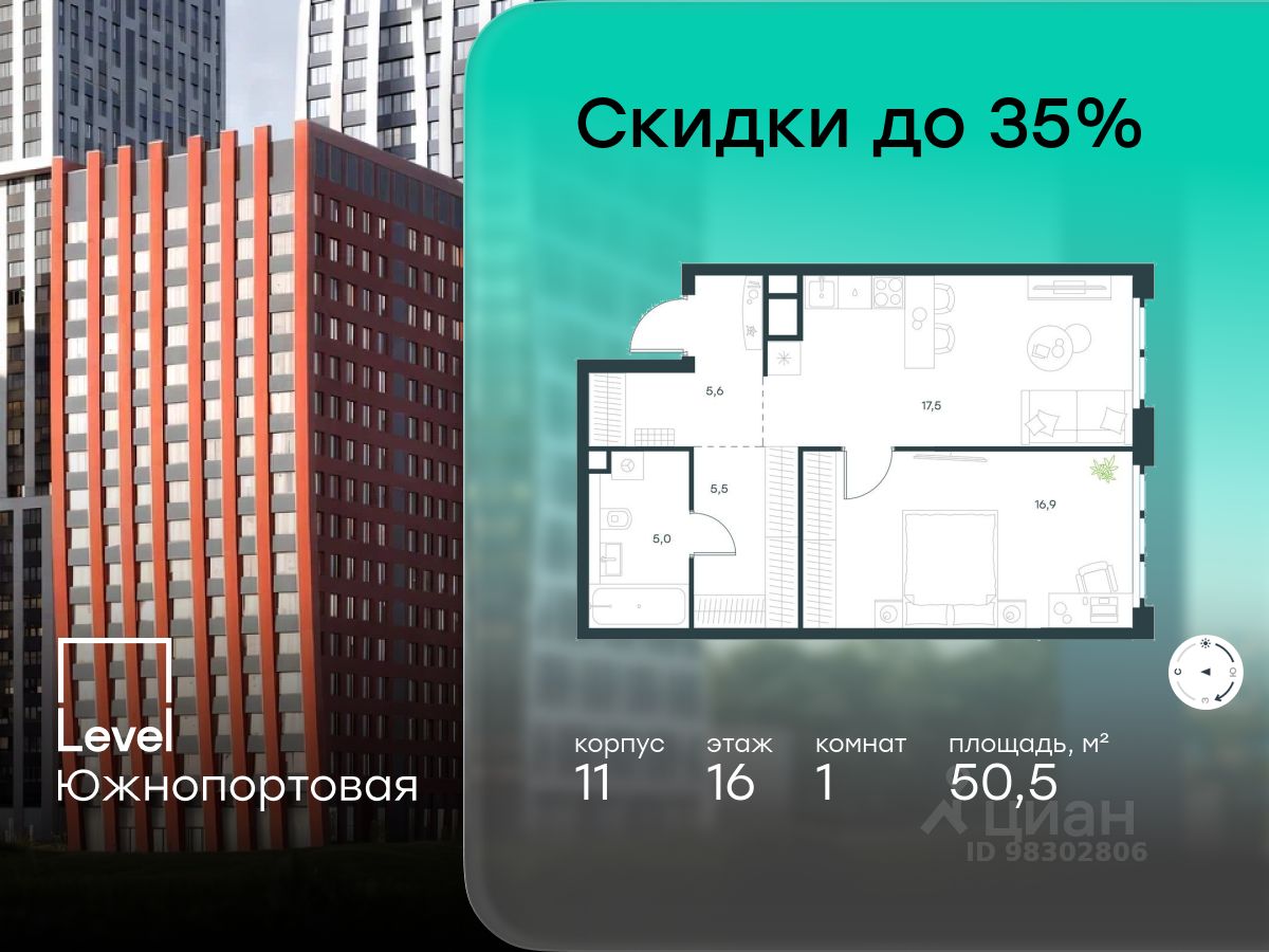 В северной части района Печатники продается 1-комнатная квартира площадью 50.50 кв.м без отделки. Квартира расположена на 16 этаже 16-этажного корпуса 11 в жилом комплексе комфорт-класса Level Южнопортовая (компания Level Group/Левел групп).