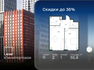 В северной части района Печатники продается 1-комнатная квартира площадью 55.80 кв.м без отделки. Квартира расположена на 2 этаже 16-этажного корпуса 11 в жилом комплексе комфорт-класса Level Южнопортовая (компания Level Group/Левел групп).