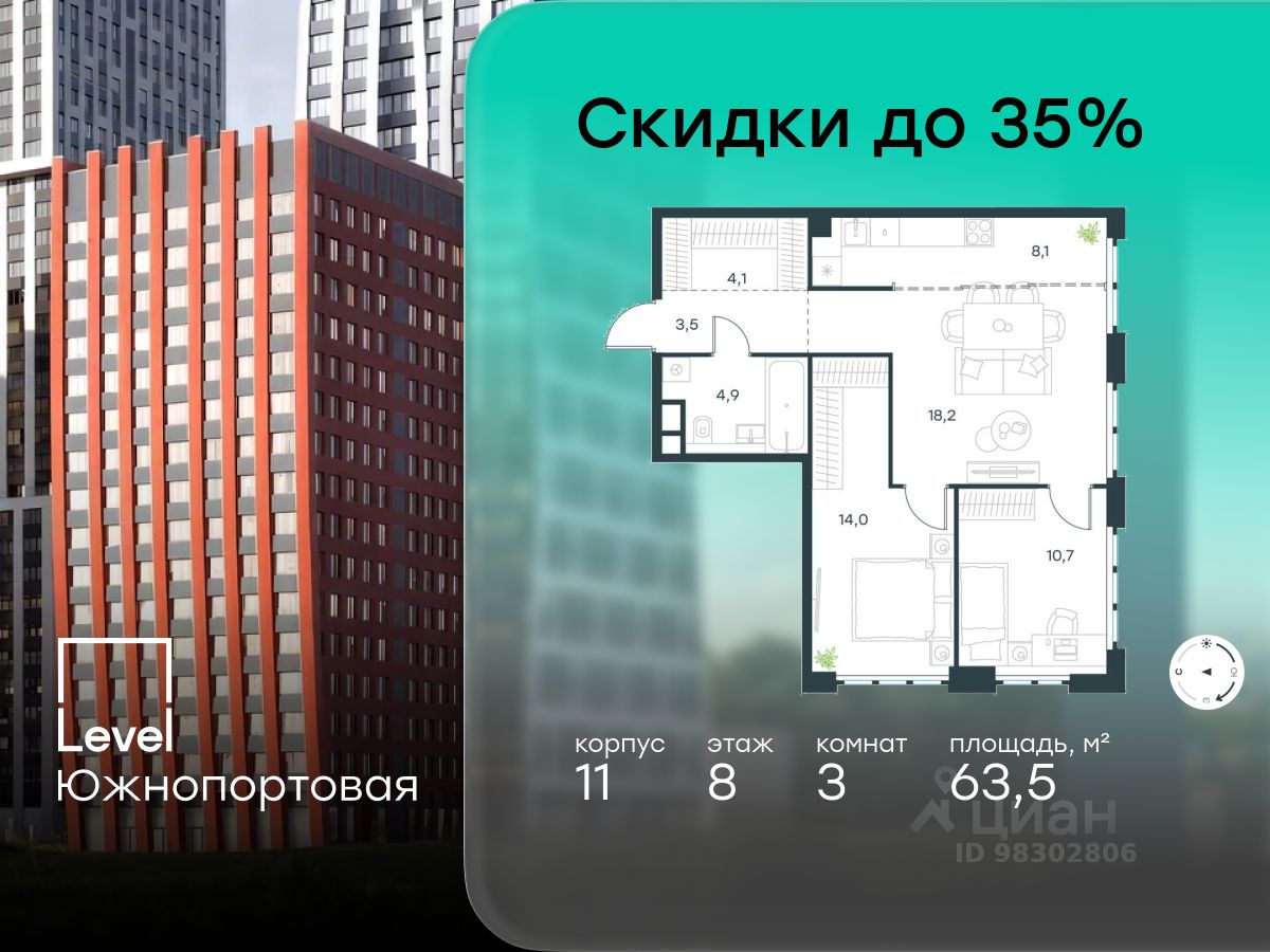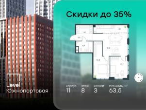 В северной части района Печатники продается 3-комнатная квартира площадью 63.50 кв.м без отделки. Квартира расположена на 8 этаже 16-этажного корпуса 11 в жилом комплексе комфорт-класса Level Южнопортовая (компания Level Group/Левел групп).