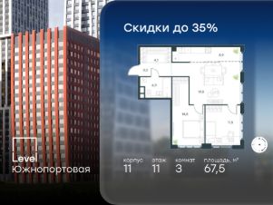 В северной части района Печатники продается 3-комнатная квартира площадью 67.50 кв.м без отделки. Квартира расположена на 11 этаже 16-этажного корпуса 11 в жилом комплексе комфорт-класса Level Южнопортовая (компания Level Group/Левел групп).