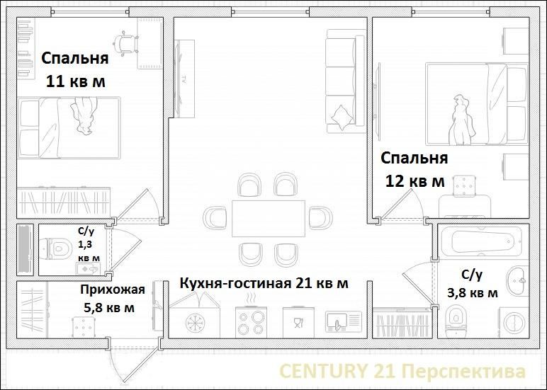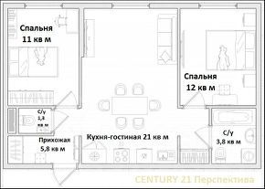 В квартире с двумя изолированными комнатами найдется свой уголок каждому члену семьи и местом встречи в ее сердце - просторной кухне-гостиной, которая объединит всех. Удобное месторасположение: