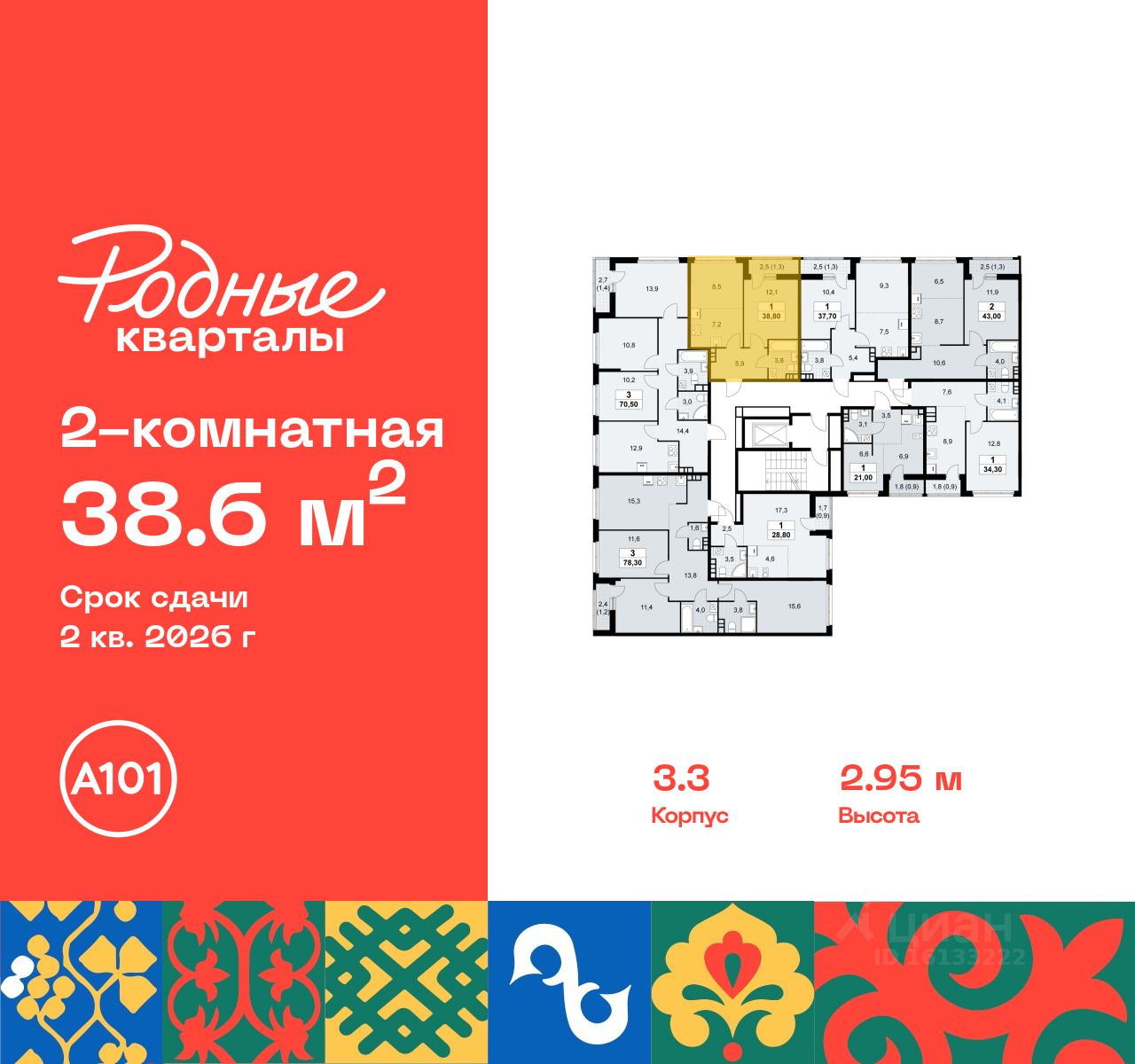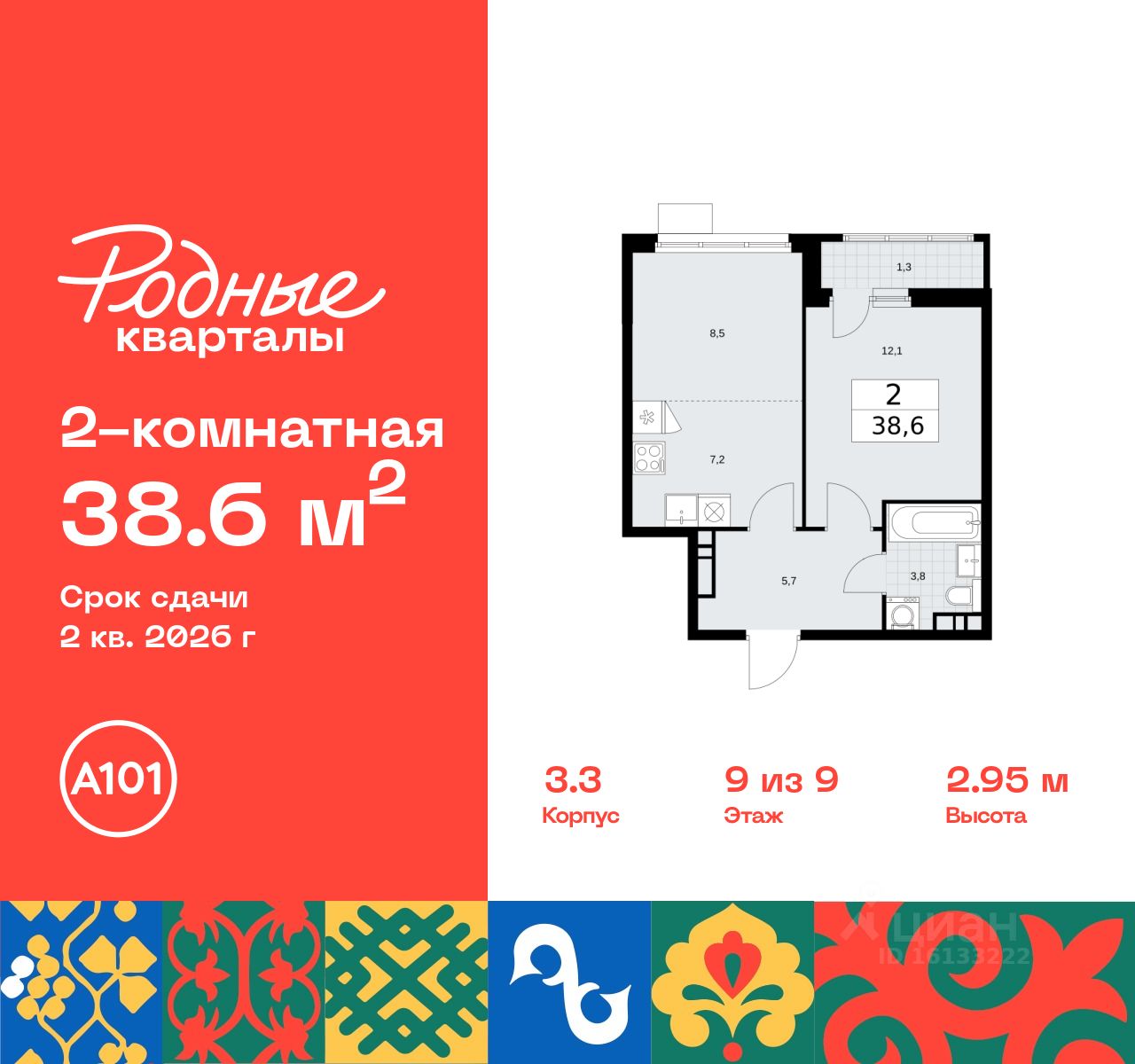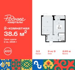 Продается двухкомнатная квартира 427 в новостройке Жилой район "Родные кварталы" по адресу Москва, ТиНАО, Новомосковский АО, Марушкинское С/П, жилой комплекс Родные Кварталы, 3.3, район Внуково, Новомосковский административный округ, Москва. Общая площадь квартиры - 38.60 кв. м., этаж 9 из 9, секция 9. Тип проекта, по которому построен дом - монолит, компания-застройщик - ООО "А101". Стоимость квартиры - 11968702 Р. Срок сдачи - 2 квартал 2026.