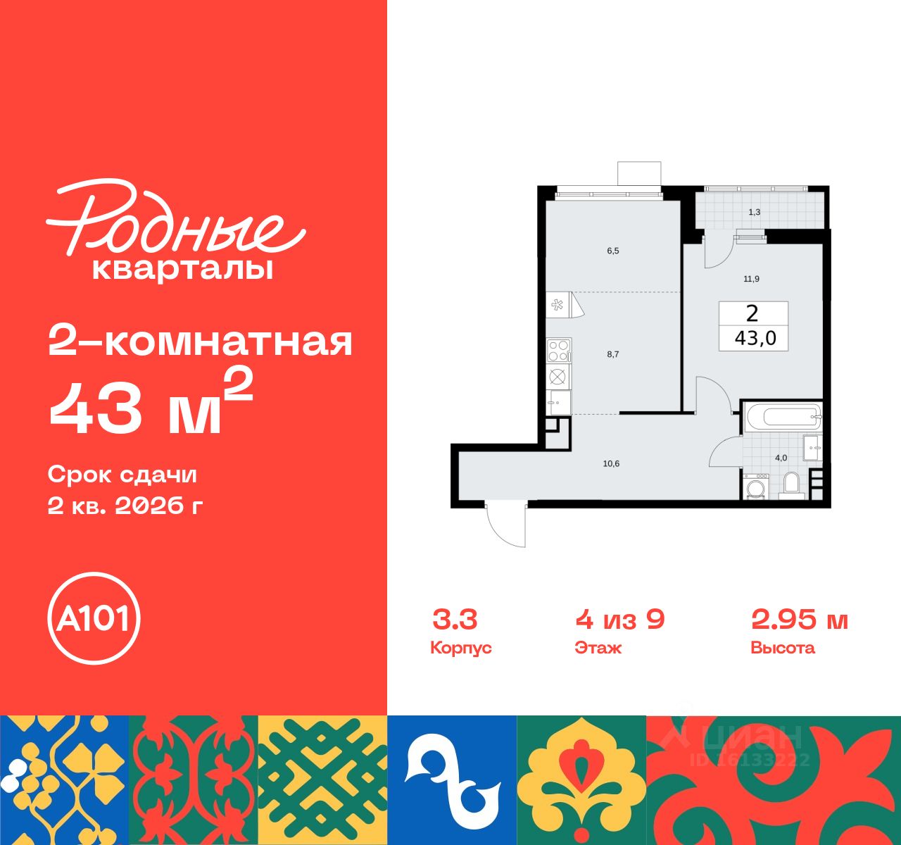 Продается двухкомнатная квартира 389 в новостройке Жилой район "Родные кварталы" по адресу Москва, ТиНАО, Новомосковский АО, Марушкинское С/П, жилой комплекс Родные Кварталы, 3.3, район Внуково, Новомосковский административный округ, Москва. Общая площадь квартиры - 43.00 кв. м., этаж 4 из 9, секция 9. Тип проекта, по которому построен дом - монолит, компания-застройщик - ООО "А101". Стоимость квартиры - 12298000 Р. Срок сдачи - 2 квартал 2026.