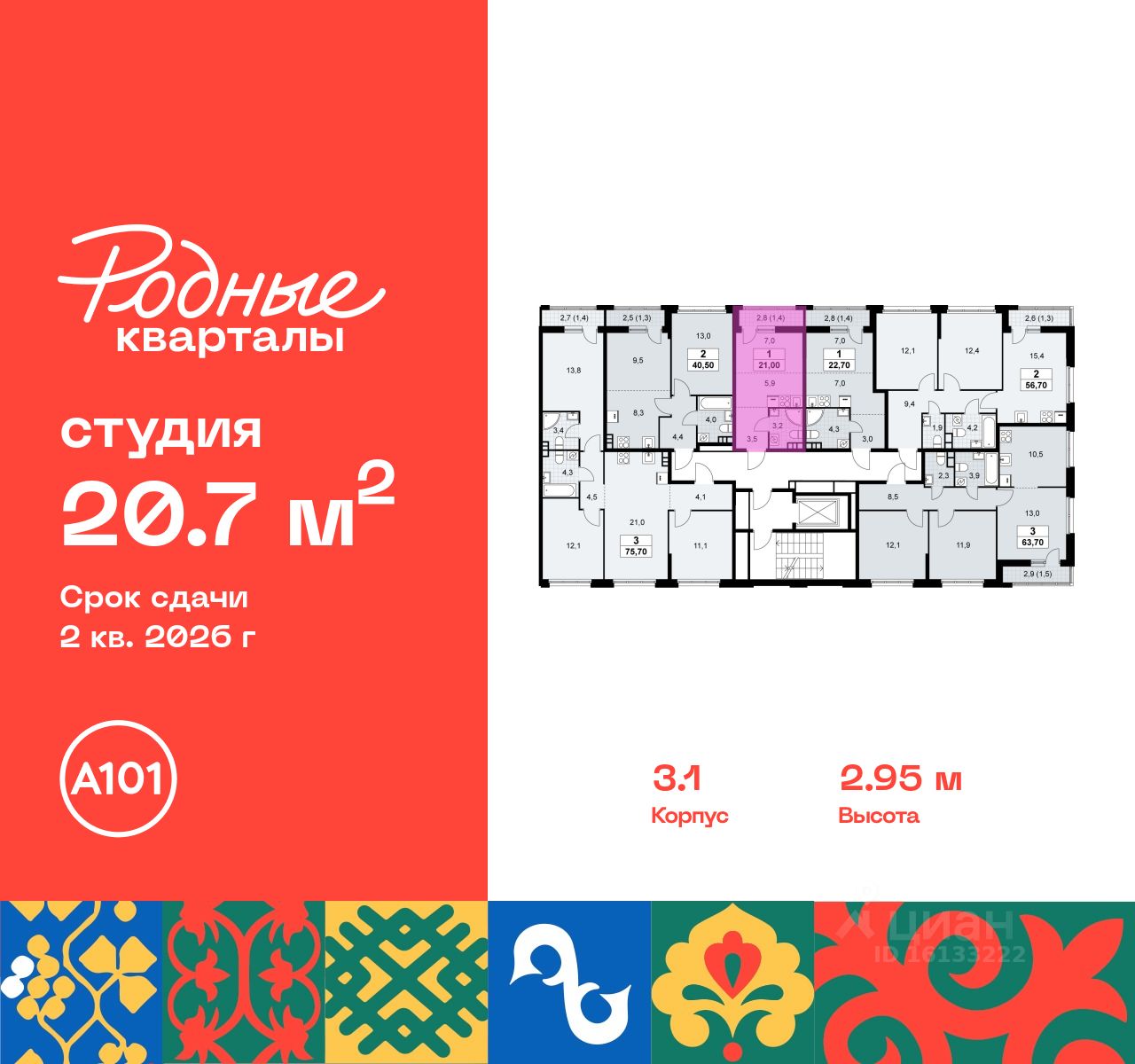 Продается студия 186 в новостройке Жилой район "Родные кварталы" по адресу Москва, ТиНАО, Новомосковский АО, Марушкинское С/П, жилой комплекс Родные Кварталы, 3.1, район Внуково, Новомосковский административный округ, Москва. Общая площадь квартиры - 20.70 кв. м., этаж 10 из 10, секция 4. Тип проекта, по которому построен дом - монолит, компания-застройщик - ООО "А101". Стоимость квартиры - 7702056 Р. Срок сдачи - 2 квартал 2026.