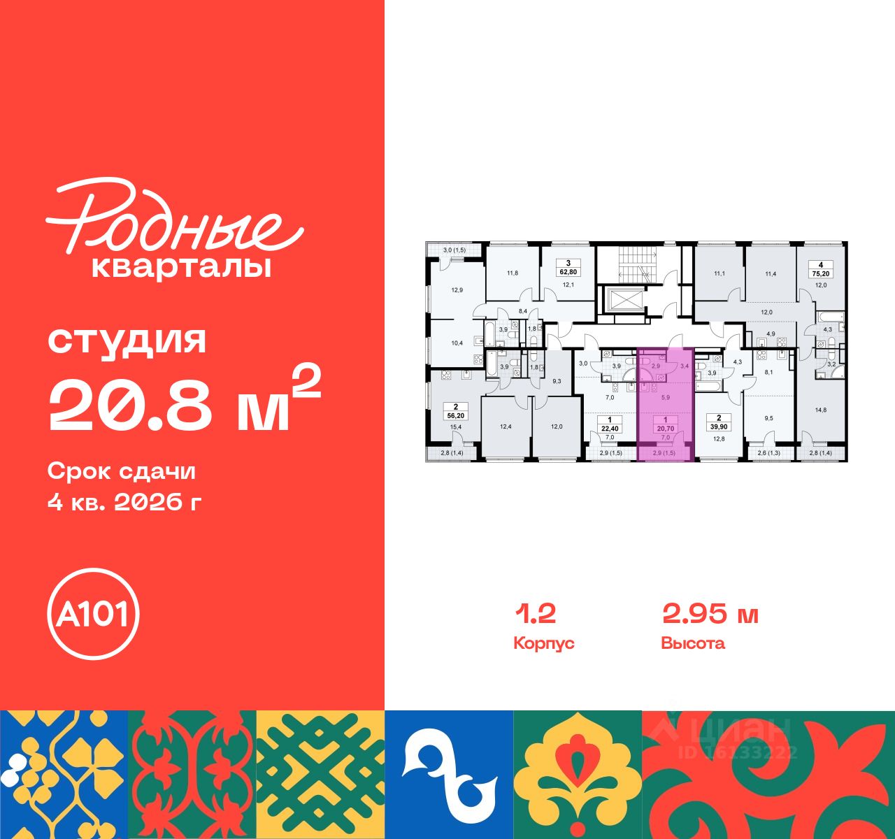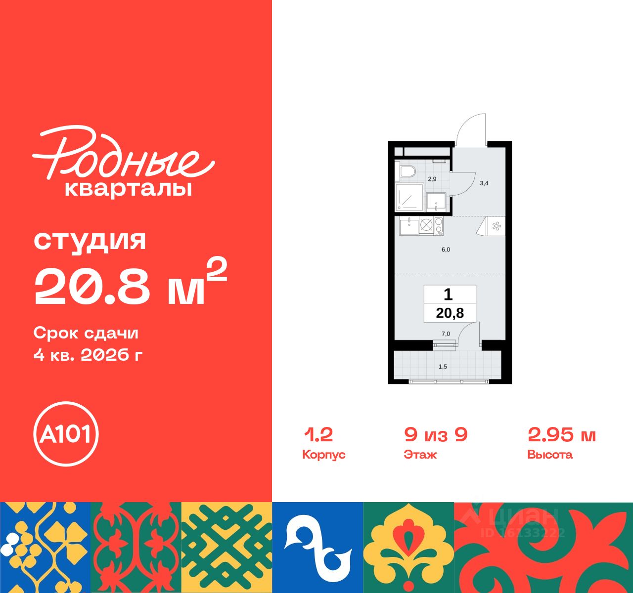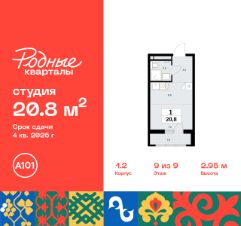 Продается студия 144 в новостройке Жилой район "Родные кварталы" по адресу Москва, ТиНАО, Новомосковский АО, Марушкинское С/П, жилой комплекс Родные Кварталы, 1.2, район Внуково, Новомосковский административный округ, Москва. Общая площадь квартиры - 20.80 кв. м., этаж 9 из 9, секция 2. Тип проекта, по которому построен дом - монолит, компания-застройщик - ООО "А101". Стоимость квартиры - 8406112 Р. Срок сдачи - 4 квартал 2026.