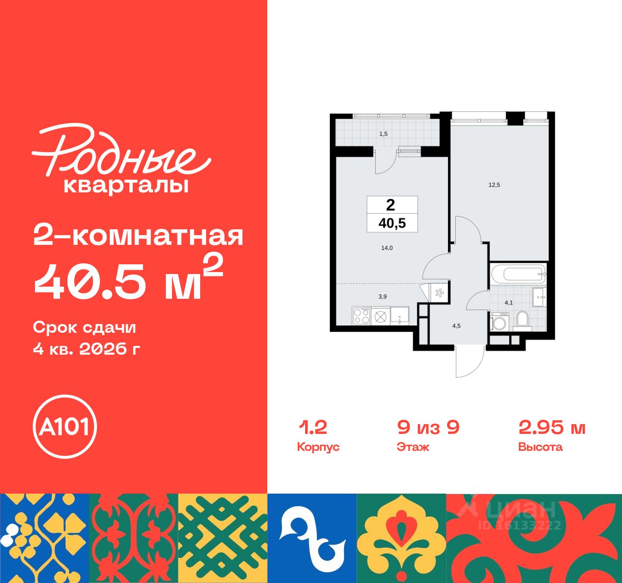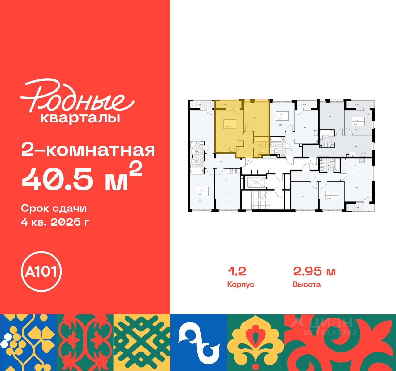 Продается двухкомнатная квартира 424 в новостройке Жилой район "Родные кварталы" по адресу Москва, ТиНАО, Новомосковский АО, Марушкинское С/П, жилой комплекс Родные Кварталы, 1.2, район Внуково, Новомосковский административный округ, Москва. Общая площадь квартиры - 40.50 кв. м., этаж 9 из 9, секция 8. Тип проекта, по которому построен дом - монолит, компания-застройщик - ООО "А101". Стоимость квартиры - 12840525 Р. Срок сдачи - 4 квартал 2026.