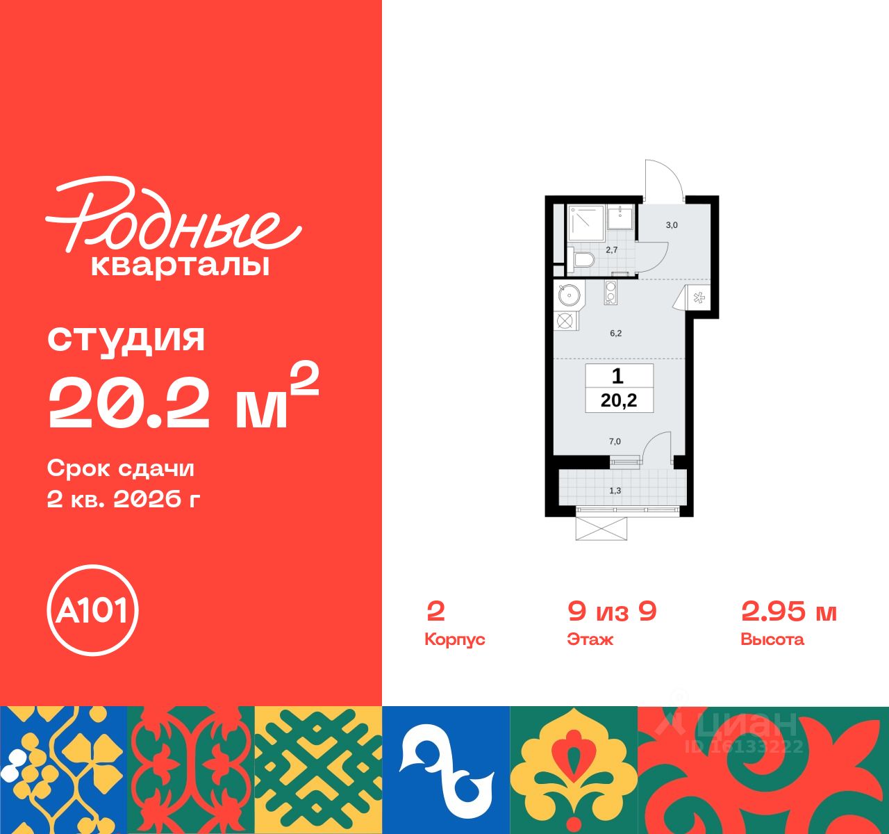 Продается студия 279 в новостройке Жилой район "Родные кварталы" по адресу Москва, ТиНАО, Новомосковский АО, Марушкинское С/П, жилой комплекс Родные Кварталы, 2, район Внуково, Новомосковский административный округ, Москва. Общая площадь квартиры - 20.20 кв. м., этаж 9 из 9, секция 6. Тип проекта, по которому построен дом - монолит, компания-застройщик - ООО "А101". Стоимость квартиры - 7385524 Р. Срок сдачи - 2 квартал 2026.