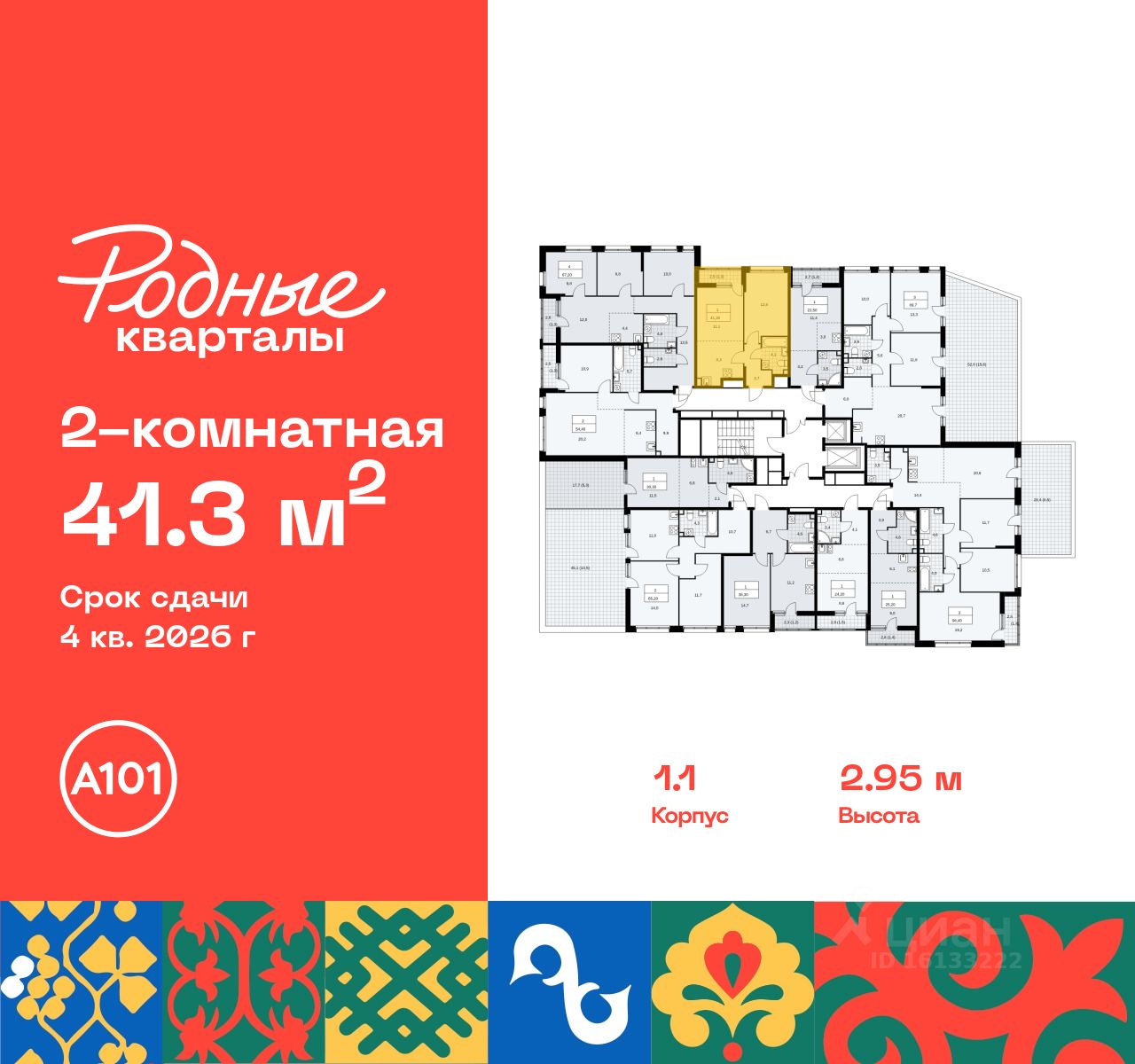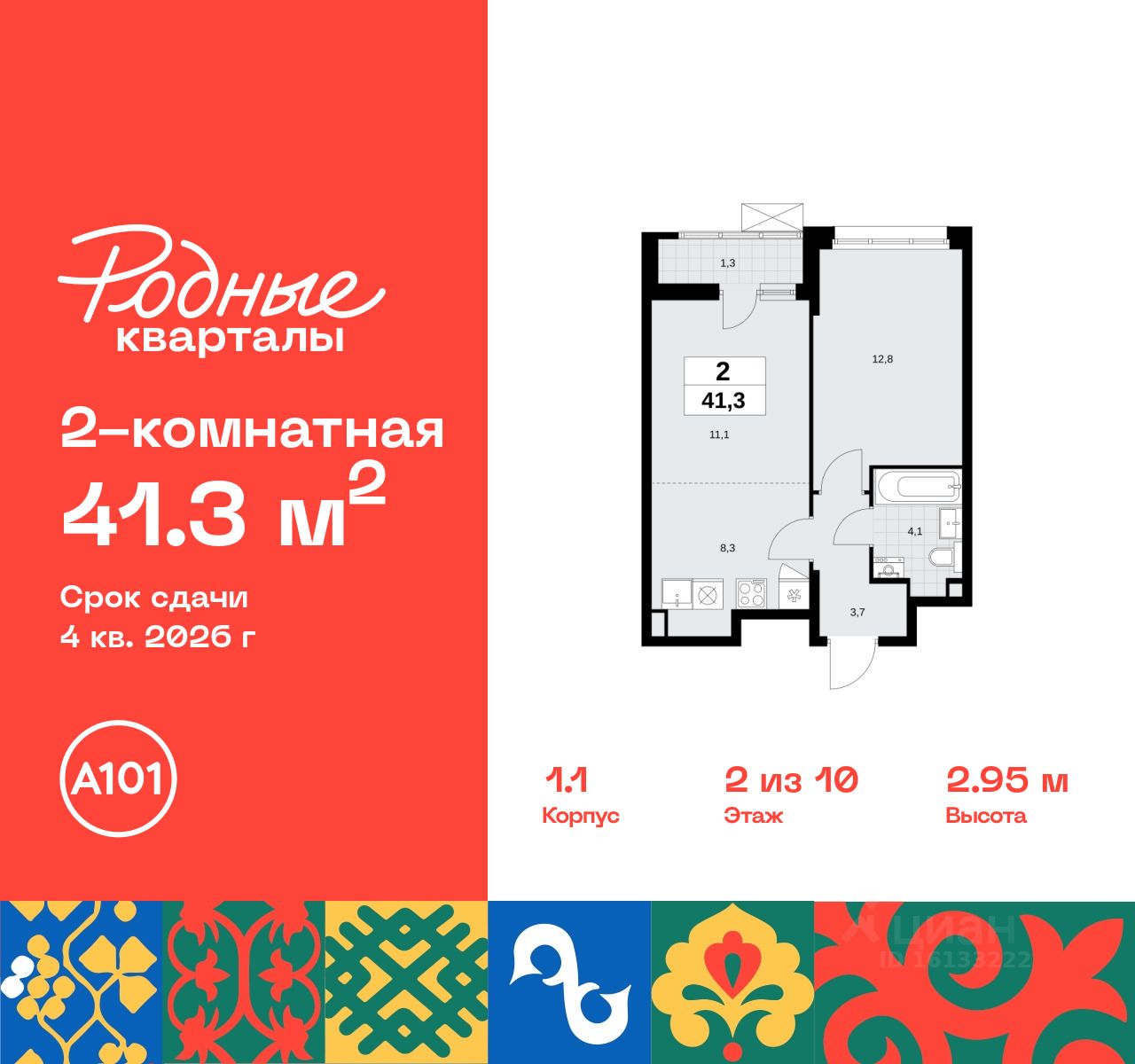 Продается двухкомнатная квартира 9 в новостройке Жилой район "Родные кварталы" по адресу Москва, ТиНАО, Новомосковский АО, Марушкинское С/П, жилой комплекс Родные Кварталы, 1.1, район Внуково, Новомосковский административный округ, Москва. Общая площадь квартиры - 41.30 кв. м., этаж 2 из 10, секция 1. Тип проекта, по которому построен дом - монолит, компания-застройщик - ООО "А101". Стоимость квартиры - 12896338 Р. Срок сдачи - 4 квартал 2026.