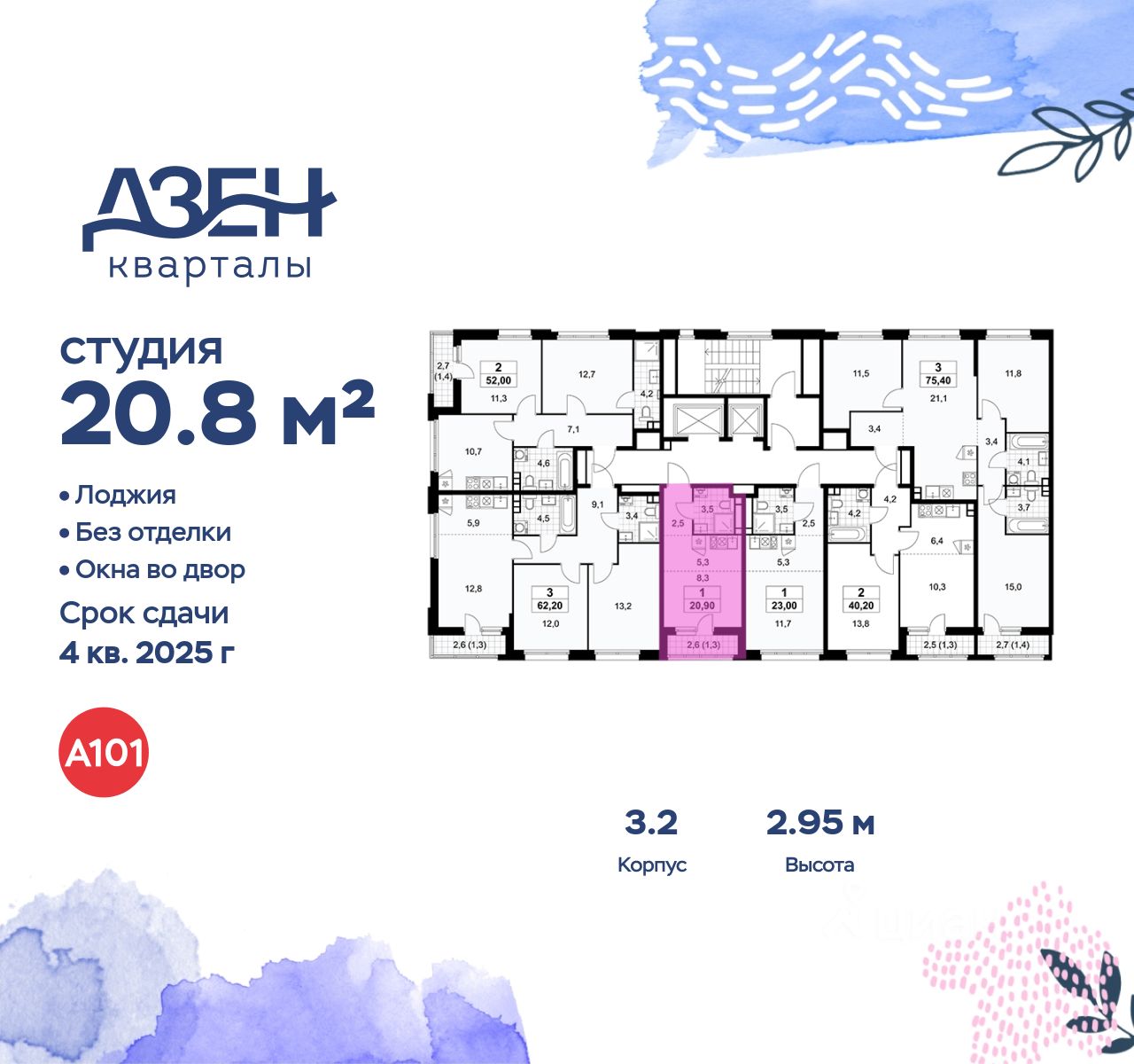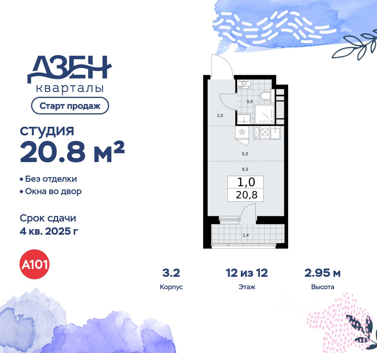 Продается студия 293 в новостройке ЖК "Дзен-кварталы" по адресу Москва, ТиНАО, Новомосковский АО, Сосенское С/П, жилой комплекс Дзен-кварталы, 3.2, район Коммунарка, Новомосковский административный округ, Москва. Общая площадь квартиры - 20.80 кв. м., этаж 12 из 12, секция 2. Тип проекта, по которому построен дом - монолит, компания-застройщик - ООО "А101". Стоимость квартиры - 10490272 Р. Срок сдачи - 4 квартал 2025.