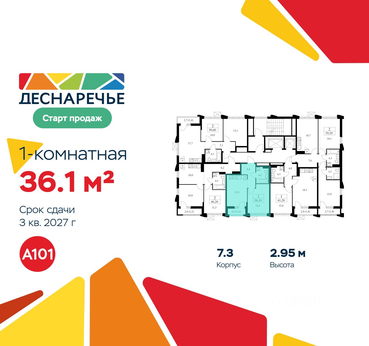 Продается однокомнатная квартира 651 в новостройке ЖК "Деснаречье" по адресу Москва, ТиНАО, Новомосковский АО, Десеновское С/П, Десна деревня, Москва, район Троицк, ЖК Деснаречье, к. 7.3. Общая площадь квартиры - 36.10 кв. м., этаж 14 из 15, секция 11. Тип проекта, по которому построен дом - монолит, компания-застройщик - ООО "А101". Стоимость квартиры - 11537199 Р. Срок сдачи - 3 квартал 2027.