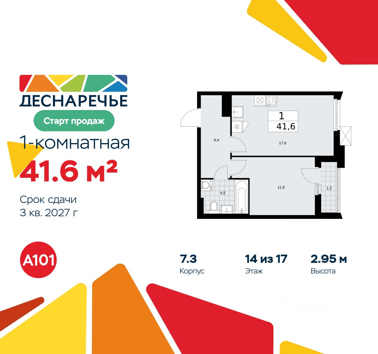 Продается однокомнатная квартира 775 в новостройке ЖК "Деснаречье" по адресу Москва, ТиНАО, Новомосковский АО, Десеновское С/П, Десна деревня, Москва, район Троицк, ЖК Деснаречье, к. 7.3. Общая площадь квартиры - 41.60 кв. м., этаж 14 из 17, секция 13. Тип проекта, по которому построен дом - монолит, компания-застройщик - ООО "А101". Стоимость квартиры - 11885120 Р. Срок сдачи - 3 квартал 2027.