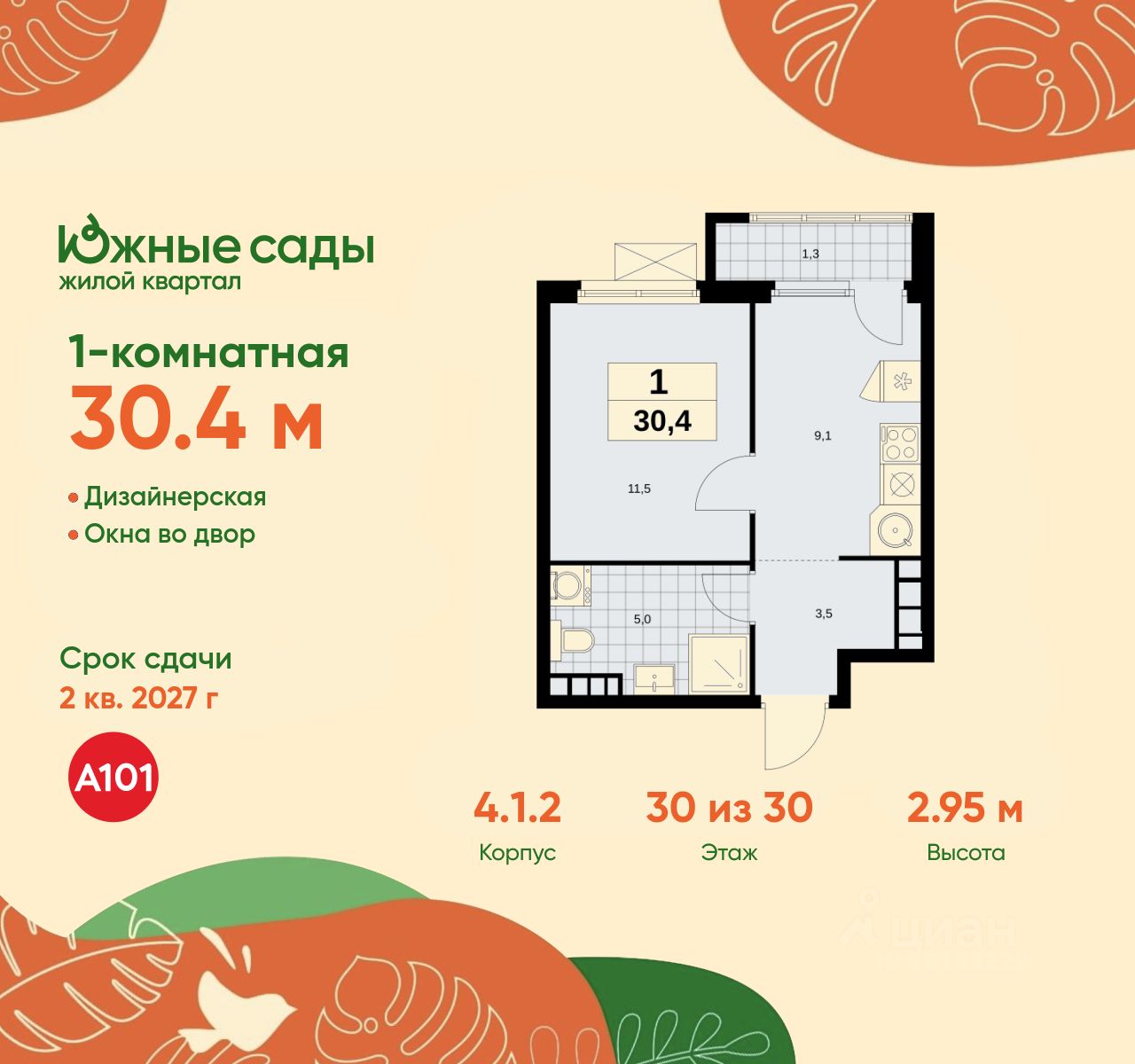 Продается однокомнатная квартира 413 в новостройке ЖК "Южные Сады" по адресу Москва, ЮЗАО, Южное Бутово, ул. Бартеневская, д. 16. Общая площадь квартиры - 30.40 кв. м., этаж 30 из 30, секция 4. Тип проекта, по которому построен дом - монолит, компания-застройщик - ООО "А101". Стоимость квартиры - 15023376 Р. Срок сдачи - 2 квартал 2027.