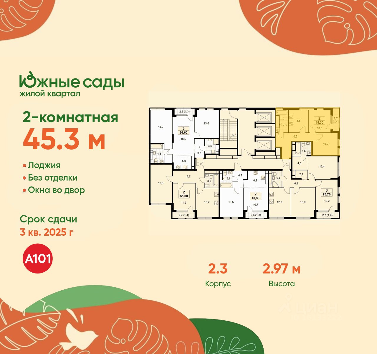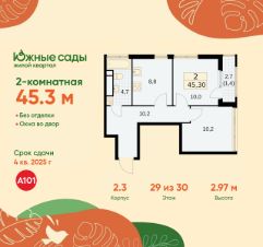 Продается двухкомнатная квартира 784 в новостройке ЖК "Южные Сады" по адресу Москва, ЮЗАО, Южное Бутово, Жилой комплекс "Южные Сады", корп. 2.3. Общая площадь квартиры - 45.30 кв. м., этаж 29 из 30, секция 6. Тип проекта, по которому построен дом - монолит, компания-застройщик - ООО "А101". Стоимость квартиры - 17024646 Р. Срок сдачи - 4 квартал 2025.