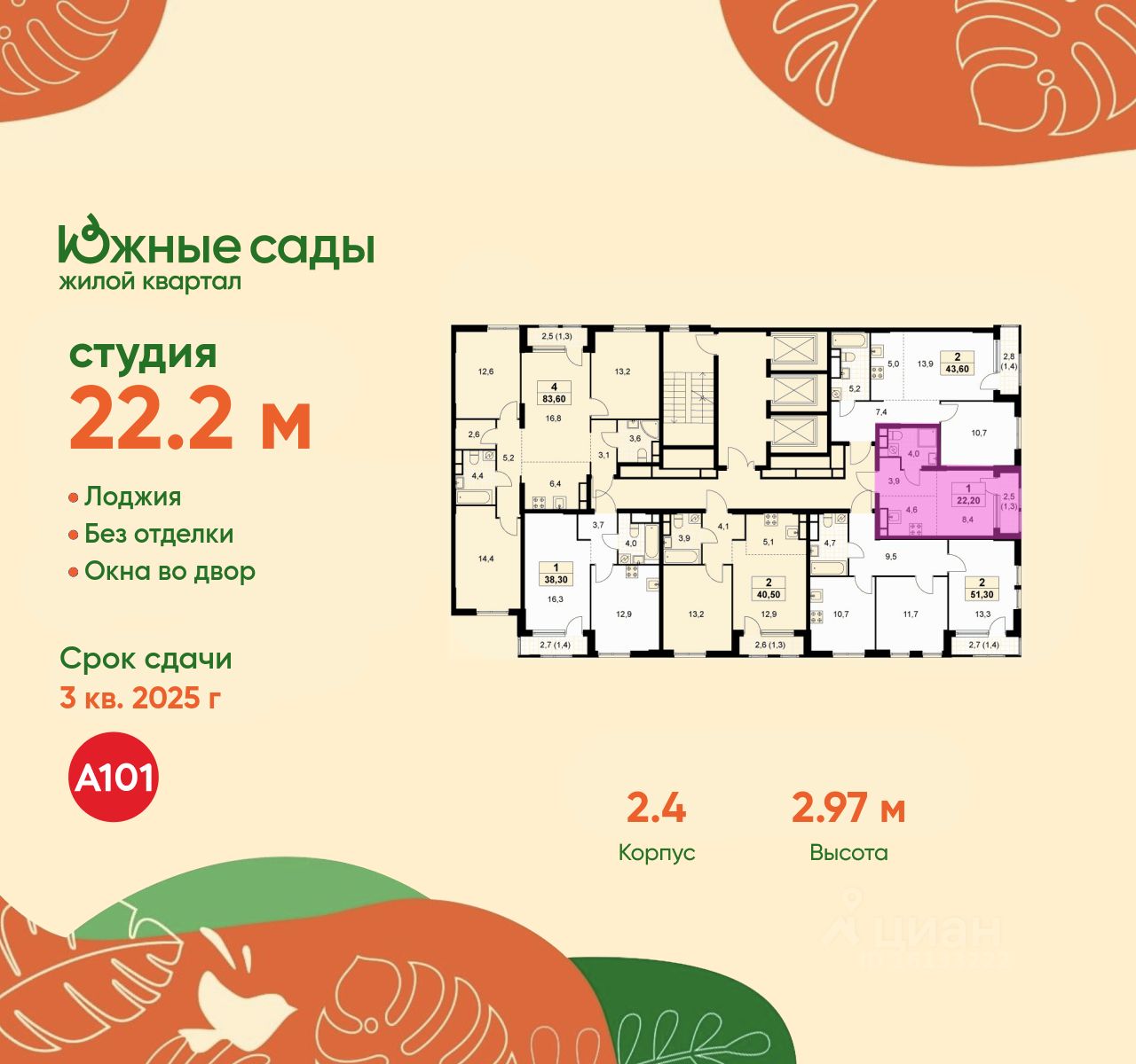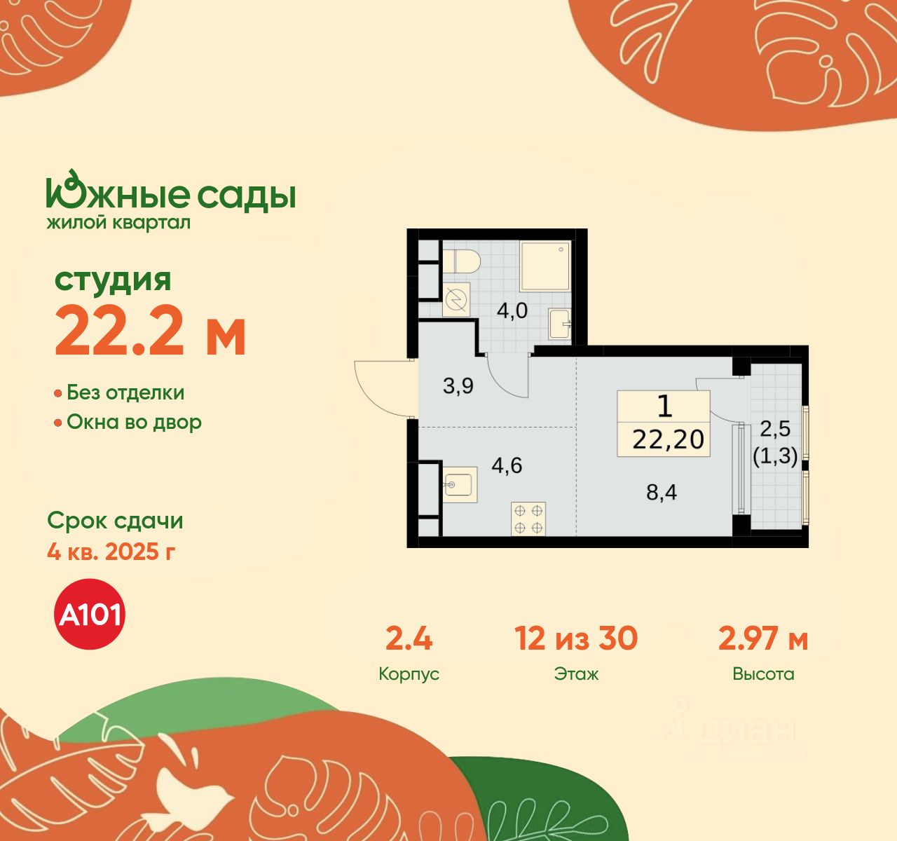 Продается студия 1089 в новостройке ЖК "Южные Сады" по адресу Москва, ЮЗАО, Южное Бутово, Жилой комплекс "Южные Сады", корп.2.4. Общая площадь квартиры - 22.20 кв. м., этаж 12 из 30, секция 9. Тип проекта, по которому построен дом - монолит, компания-застройщик - ООО "А101". Стоимость квартиры - 10963692 Р. Срок сдачи - 4 квартал 2025.