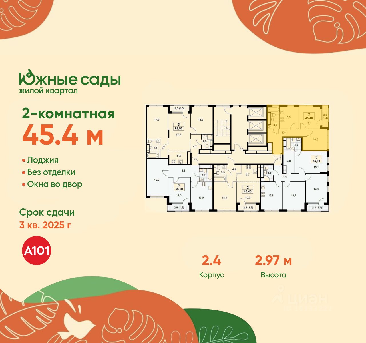Продается двухкомнатная квартира 1184 в новостройке ЖК "Южные Сады" по адресу Москва, ЮЗАО, Южное Бутово, Жилой комплекс "Южные Сады", корп.2.4. Общая площадь квартиры - 45.40 кв. м., этаж 30 из 30, секция 9. Тип проекта, по которому построен дом - монолит, компания-застройщик - ООО "А101". Стоимость квартиры - 18218566 Р. Срок сдачи - 4 квартал 2025.