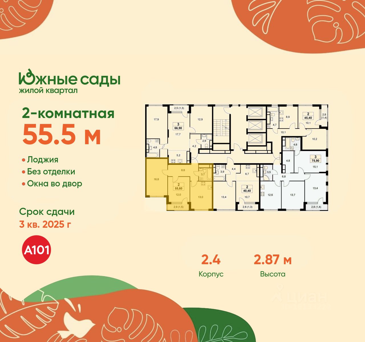 Продается двухкомнатная квартира 1187 в новостройке ЖК "Южные Сады" по адресу Москва, ЮЗАО, Южное Бутово, Жилой комплекс "Южные Сады", корп.2.4. Общая площадь квартиры - 55.50 кв. м., этаж 30 из 30, секция 9. Тип проекта, по которому построен дом - монолит, компания-застройщик - ООО "А101". Стоимость квартиры - 18797295 Р. Срок сдачи - 4 квартал 2025.