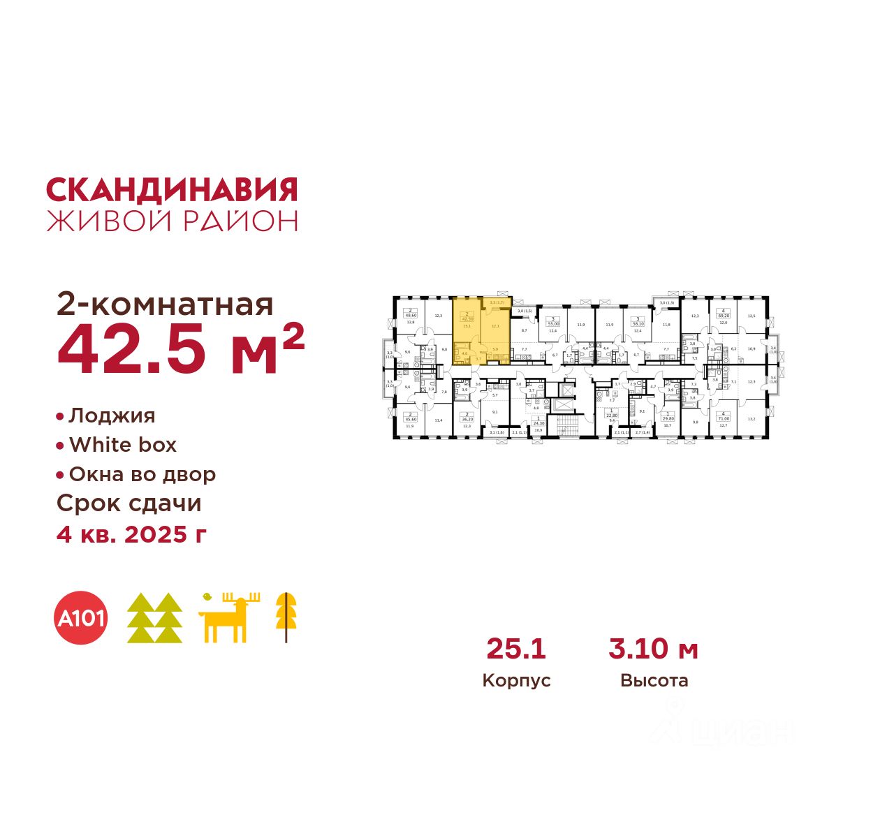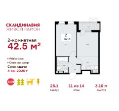 Продается двухкомнатная квартира 104 в новостройке Жилой район "Скандинавия" по адресу Москва, ТиНАО, Новомосковский АО, Сосенское С/П, Коммунарка пос., жилой комплекс Скандинавия, 25.1, район Коммунарка, Новомосковский административный округ, Москва. Общая площадь квартиры - 42.50 кв. м., этаж 11 из 14, секция 1. Тип проекта, по которому построен дом - монолит, компания-застройщик - ООО "А101". Стоимость квартиры - 18327700 Р. Срок сдачи - 1 квартал 2026.