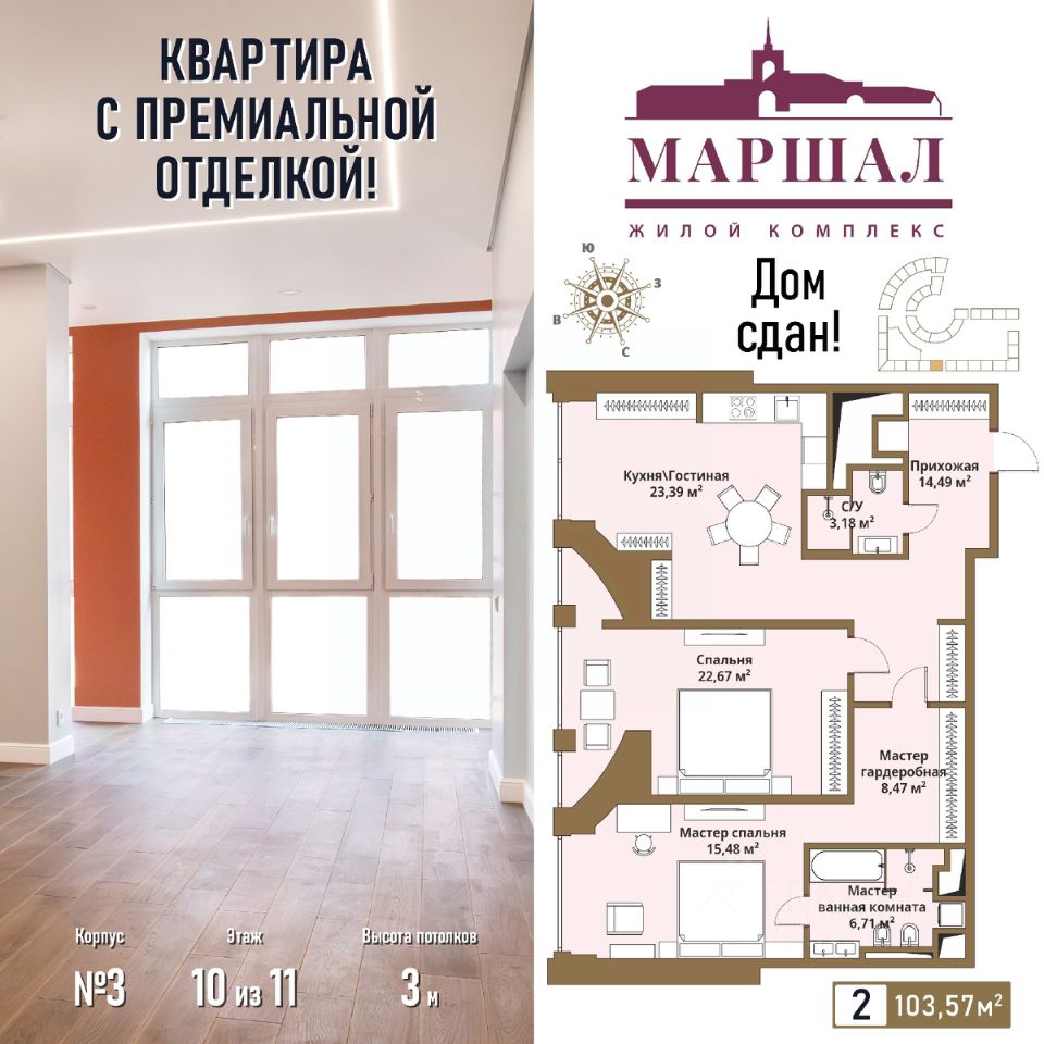 Продаётся 2-комнатная квартира в сданном доме (Маршала Рыбалко, 2К3), срок сдачи: IV-кв. 2011, общей площадью 103.57 кв.м., на 10 этаже. МФК "Маршал" построен по авторскому проекту архитектора с мировым именем и получил награду TREFI "Лучший проект бизнес-класса в Москве". Готовая квартира в элитном МФК "Маршал" с премиальной отделкой "под ключ" (экологичное напольное покрытие - инженерная доска и керамогранит, высококачественные системы кондиционирования и сантехническое оборудование премиум класса Villeroy & Boch, Grohe), выполненной европейскими специалистами по эксклюзивным дизайн-проектам, подчеркнет высокий статус владельца. В квартире выполнен новый ремонт и НИКТО НЕ ЖИЛ с момента ввода в эксплуатацию. Квартиры 3-го корп. продаются с полной отделкой, что обеспечивает комфорт проживания в доме сразу после получения ключей, т.к. исключает длительный период ремонта квартир - у вас и соседей, а также сохранит презентабельные входные группы в идеальном состоянии. МФК "Маршал" построен по авторскому проекту архитектора с мировым именем и получил награду TREFI "Лучший проект бизнес-класса в Москве". Это самодостаточный город в городе на просторной - 6,3 га - охраняемой территории, большую часть которой занимают зеленые зоны с деревьями, есть сквер с аллеями, цветниками и фонтаном с разноцветной подсветкой в вечернее время, детские городки, спортивные площадки для подвижных игр, воркаута и теннисный корт с мягким покрытием. Из окон от известного производителя открывается прекрасный панорамный вид на столицу с современными элитными жилыми комплексами с интересной и изысканной архитектурой или просторный двор-патио МФК "Маршал". Вход в подъезды 3-го корпуса на уровне земли. Вам будет комфортно заходить с детской коляской, самокатом, велосипедом или с чемоданом, возвращаясь из путешествия. Презентабельные входные группы, испанские премиальные лифты ORONA. В квартирах установлены видеодомофоны премиум-класса итальянской компании Bpt. К вашим услугам богатая собственная инфраструктура МФК "Маршал": детсады (в т. ч. английский), творческие и спортивные студии, студия раннего плавания, здание фитнес-центра с бассейном, минимаркет AB Daily, подземный паркинг на 1200 м/м, химчистка, салоны красоты, кафе, рестораны, БЦ класса B+, где можно арендовать/купить офис и работать рядом с домом, и др. У комплекса уникальная транспортная доступность: рядом ТПУ "Панфиловская", Северо-Западная хорда, соединяющая несколько районов столицы, в 5 мин. ходьбы - ст. м. Октябрьское Поле. В нескольких мин. езды - Ленинградский пр-т, по которому можно быстро доехать до ТТК или центра Москвы, и Ленинградское ш., ведущее к аэропорту Шереметьево. Рядом с комплексом расположена Церковь Иконы Божией Матери, в 10 мин. ходьбы - Большая Всехсвятская Роща, где можно увлекательно проводить время всей семьей! В развитой внешней инфраструктуре респектабельного района Щукино есть всё, что нужно для комфортной и интересной жизни.