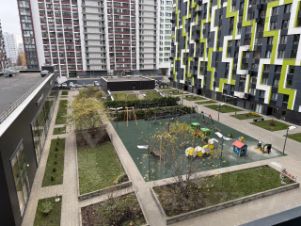 Обустроенный закрытый внутренний двор с зоной Work out, детской площадкой и зоной отдыха, озеленение.