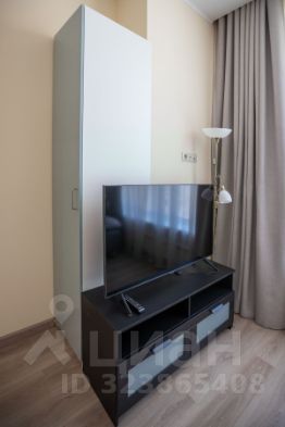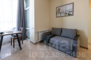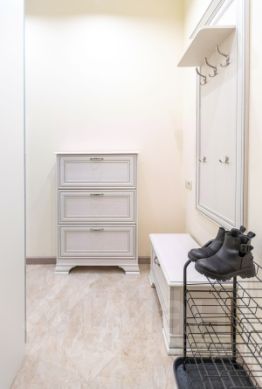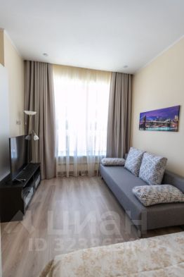 Гостиная совмещена со спальней, при этом зона отдыха отделена лёгким зонированием — создаётся ощущение двух отдельных помещений. Пространство продумано до мелочей, интерьер выполнен в светлых, уютных тонах.