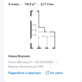 Просторная 3-хкомнатная квартира в новом развитом ЖК"Новое Внуково".