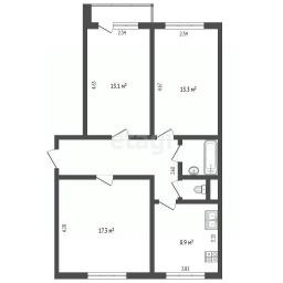 Три изолированные комнаты, распашная планировка, окна выходят на две стороны дома. В одной из комнат застекленный балкон. На полу дубовый паркет в отличном состоянии. Высота до потолков 2,64 м.