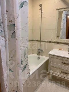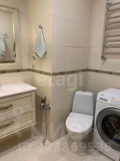 Совмещенный санузел с полноразмерной ванной, стиральной машиной и большим полотенцесушителем.