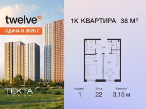 1-комн. квартира в ЖК "Твелв" на 22 этаже в 34 этажном здании Корпус 1. Общая площадь: 38 кв.м., жилая: 12.80 кв.м. Высота потолков 3.15 м.