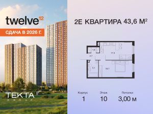 2-комн. квартира в ЖК "Твелв" на 10 этаже в 34 этажном здании Корпус 1. Общая площадь: 43.6 кв.м., жилая: 27.90 кв.м. Высота потолков 3.00 м.