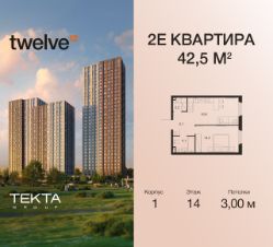 2-комн. квартира в ЖК "Twelve" на 14 этаже в 34 этажном здании Корпус 1. Общая площадь: 42.5 кв.м., жилая: 25.50 кв.м. Высота потолков 3.00 м.