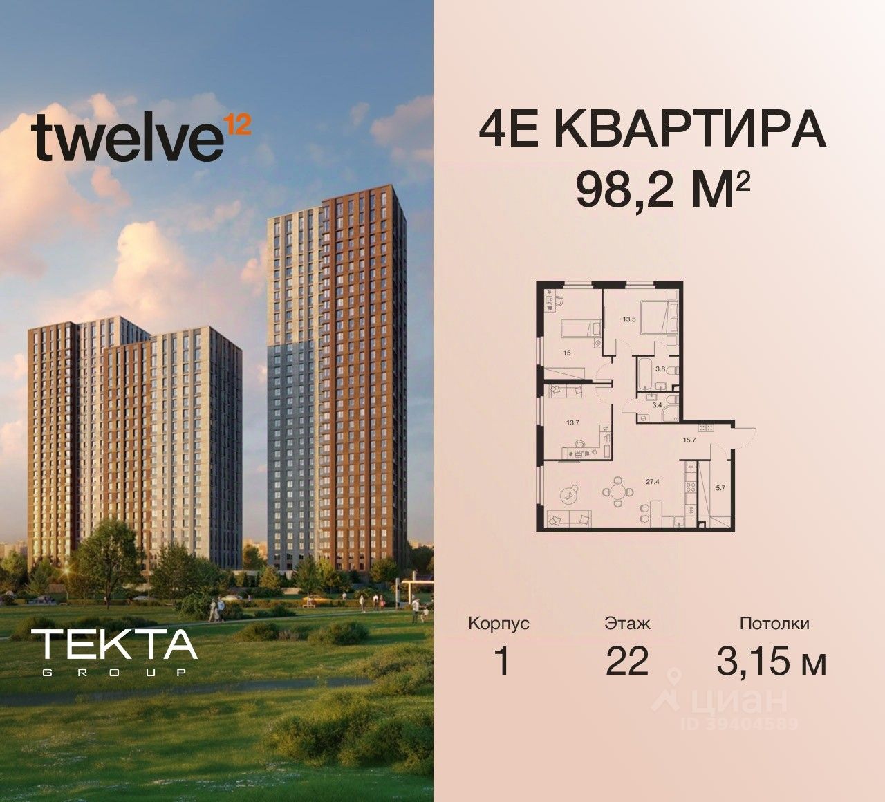 4-комн. квартира в ЖК "Twelve" на 22 этаже в 34 этажном здании Корпус 1. Общая площадь: 98.2 кв.м., жилая: 62.20 кв.м. Высота потолков 3.15 м.