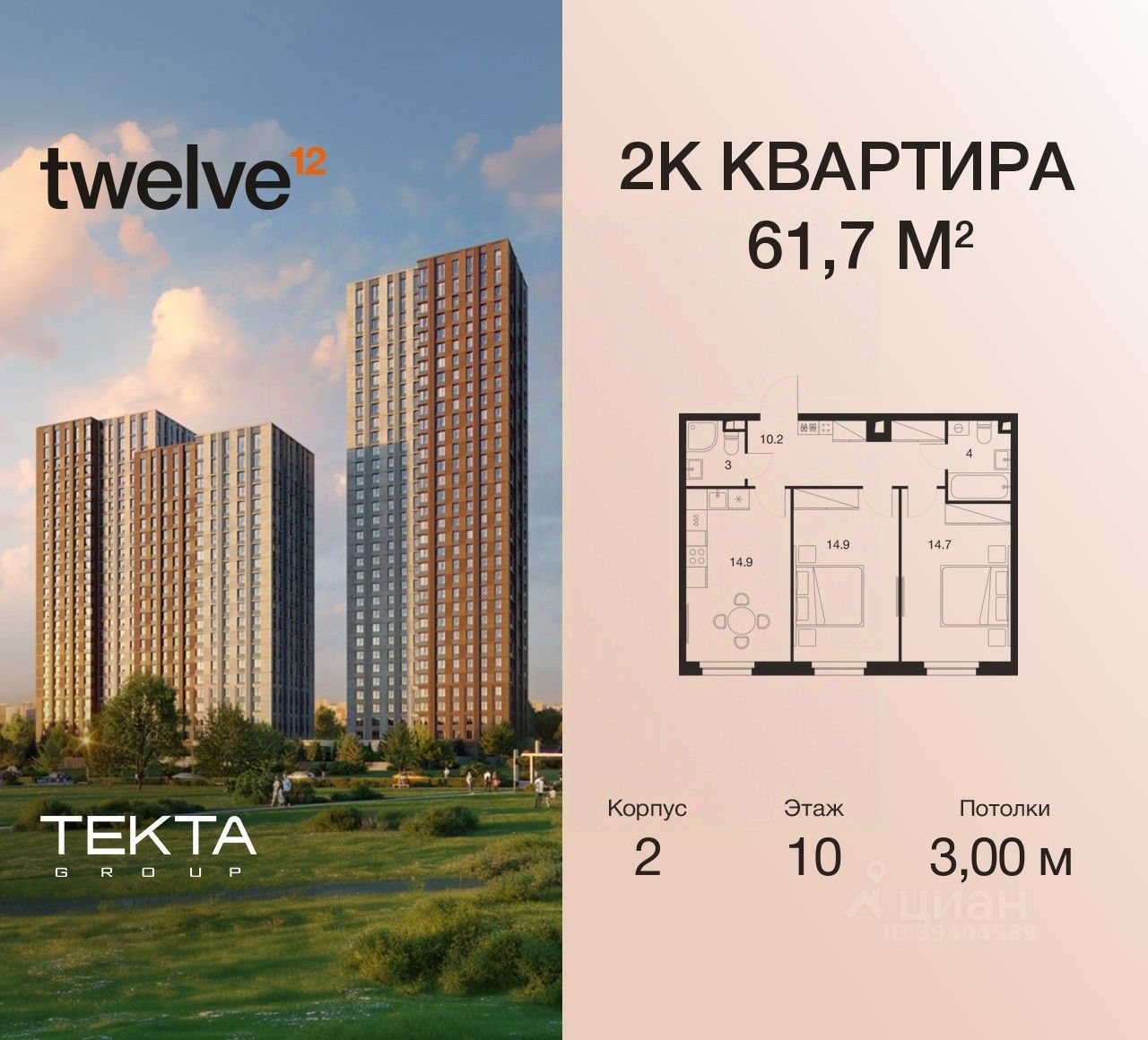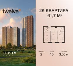 2-комн. квартира в ЖК "Twelve" на 10 этаже в 22 этажном здании Корпус 2. Общая площадь: 61.7 кв.м., жилая: 29.60 кв.м. Высота потолков 3.00 м.