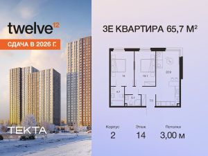 3-комн. квартира в ЖК "Twelve" на 14 этаже в 22 этажном здании Корпус 2. Общая площадь: 65.7 кв.м., жилая: 43.30 кв.м. Высота потолков 3.00 м.