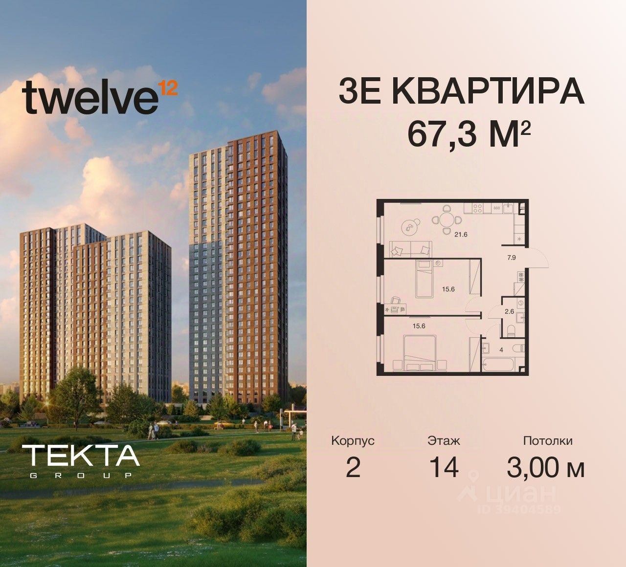 3-комн. квартира в ЖК "Twelve" на 14 этаже в 22 этажном здании Корпус 2. Общая площадь: 67.3 кв.м., жилая: 42.60 кв.м. Высота потолков 3.00 м.