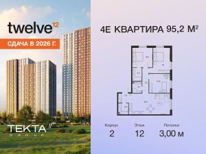 4-комн. квартира в ЖК "Твелв" на 12 этаже в 22 этажном здании Корпус 2. Общая площадь: 95.2 кв.м., жилая: 62.90 кв.м. Высота потолков 3.00 м.