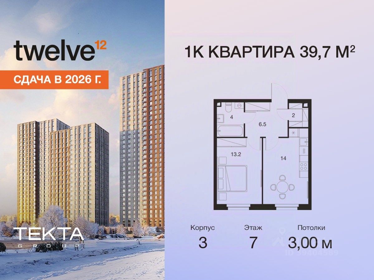 1-комн. квартира в ЖК "Twelve" на 7 этаже в 28 этажном здании Корпус 3. Общая площадь: 39.7 кв.м., жилая: 13.20 кв.м. Высота потолков 3.00 м.