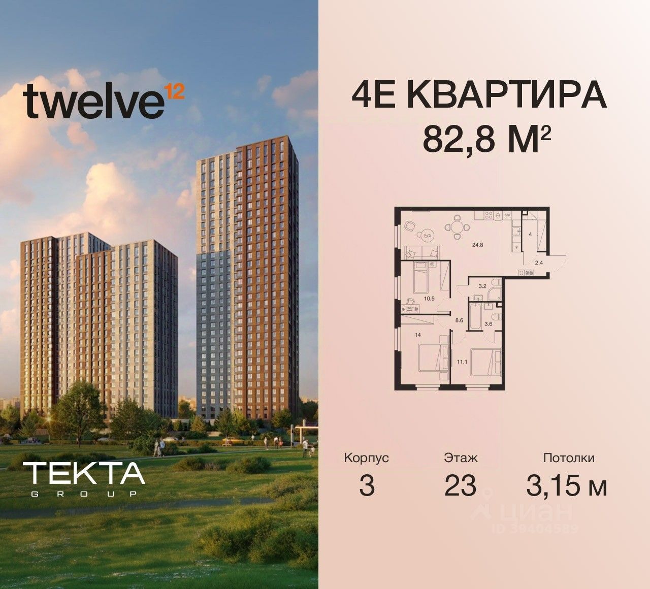 4-комн. квартира в ЖК "Twelve" на 23 этаже в 28 этажном здании Корпус 3. Общая площадь: 82.8 кв.м., жилая: 53.30 кв.м. Высота потолков 3.15 м.