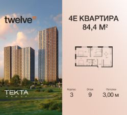 4-комн. квартира в ЖК "Twelve" на 9 этаже в 28 этажном здании Корпус 3. Общая площадь: 84.4 кв.м., жилая: 58.00 кв.м. Высота потолков 3.00 м.