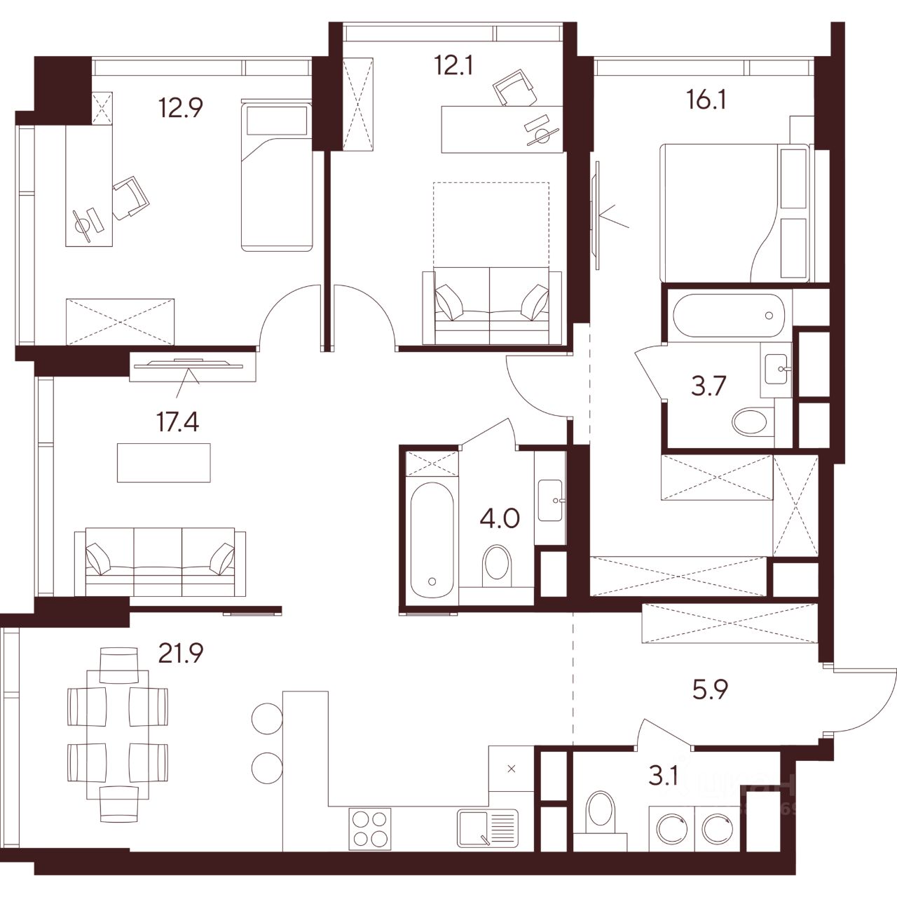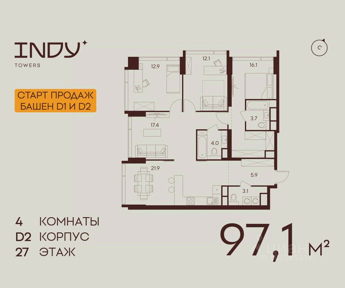 Продается просторная 4-комнатная квартира на 27 этаже жилого комплекса Indy Towers. Срок сдачи: 3 кв. 2029 г.