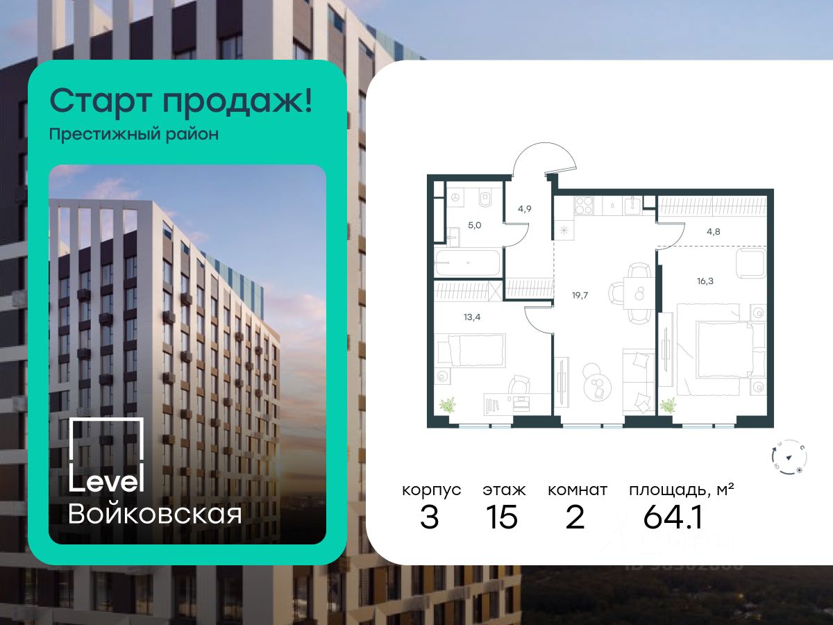 Продается 2-комнатная квартира площадью 64.10 кв. м без отделки. Квартира находится на 15 этаже 20-этажного корпуса 3, в новом жилом комплексе бизнес-класса Level Войковская, расположенном рядом с живописным заповедником "Покровское-Стрешнево" (застройщик - компания Level Group/Левел групп).