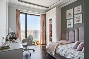 Функциональная планировка: кухня-гостиная, мастер-спальня с собственной гардеробной и ванной, вторая спальня со своим санузлом, гостевой санузел, гардеробная, кладовая, прихожая. Благодаря панорамному остеклению пространство наполнено естественным светом, открываются виды на Ходынский бульвар и на "Триумф-Палас".