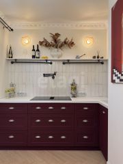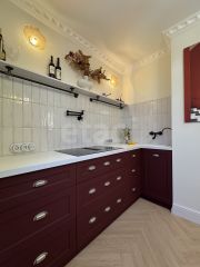 В основе интерьера лежит индивидуальный проект, где глубокий цвет бургунди на кухонном гарнитуре сочетается с благородным шпоном ореха в перегородке, создавая атмосферу современного европейского стиля.