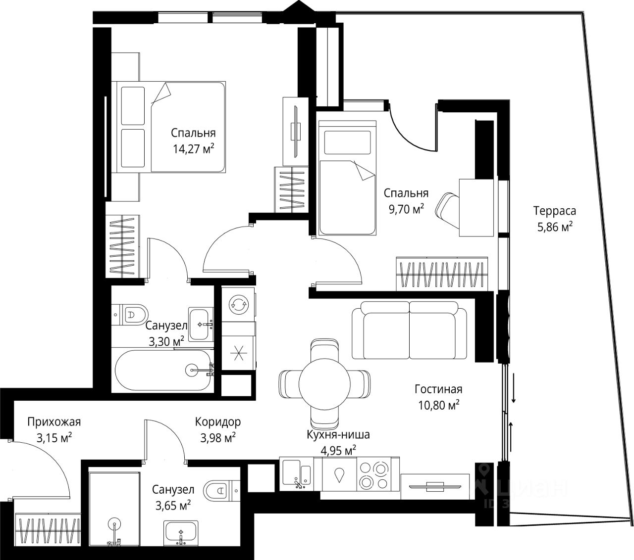 В продаже квартира площадью 59.66 м² без отделки на 15 этаже 46 этажного дома. Квартира расположена в корпусе Leo.