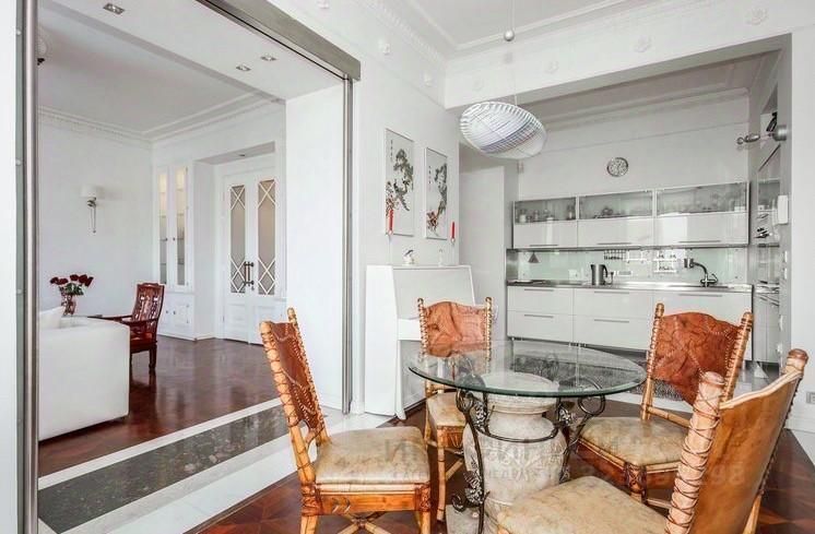 Ремонт: авторский дизайн-проект в духе сталинского ампира. Художественный паркет, мраморные полы с подогревом, двухметровый раздвижной проем между гостиной и столовой.