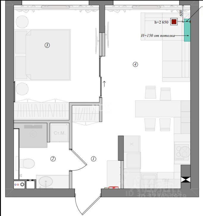 • Просторная кухня-гостиная 15 м² — центр квартиры, где удобно готовить, собираться семьёй или работать.